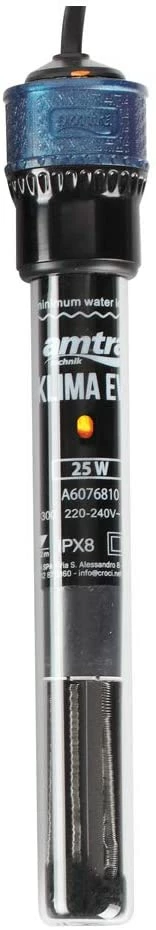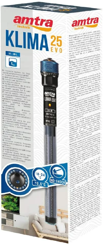 AMTRA KLIMA EVO ist eine automatische voll tauchfähige Aquarienheizung. Die Temperatureinstellung ist einfach und präzise. Der Thermostat ist sehr empfindlich und äußerst zuverlässig, um die eingestellte Temperatur konstant zu halten. Das hocheffiziente Heizelement mit geringem Platzbedarf ist für einen sicheren Betrieb ausgelegt und gebaut Es wird komplett mit Stützhaken und Ankersaugbechern geliefert. Quarzrohr, Nickel-Chrom-Heizelement, interne Goldkontakte und die Möglichkeit einer Temperaturneukalibrierung sind die Hauptstärken dieses Heizgeräts.