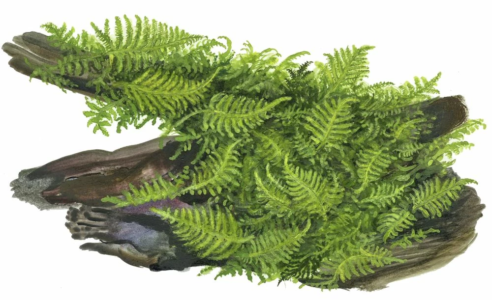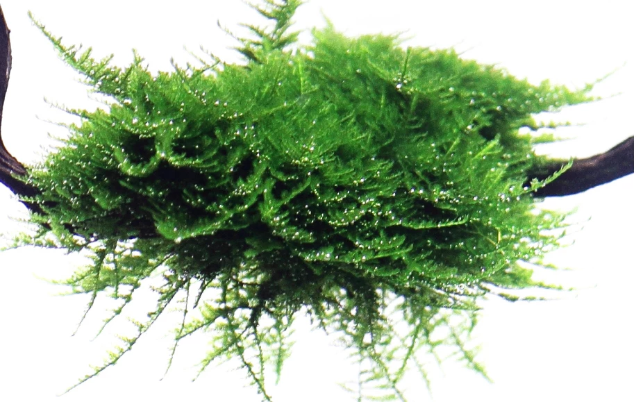 die an Tannenzweige erinnert. Stellt höhere Ansprüche als normales Javamoos und wächst langsamer. Aber es haftet gut an Wurzeln und Steinen.