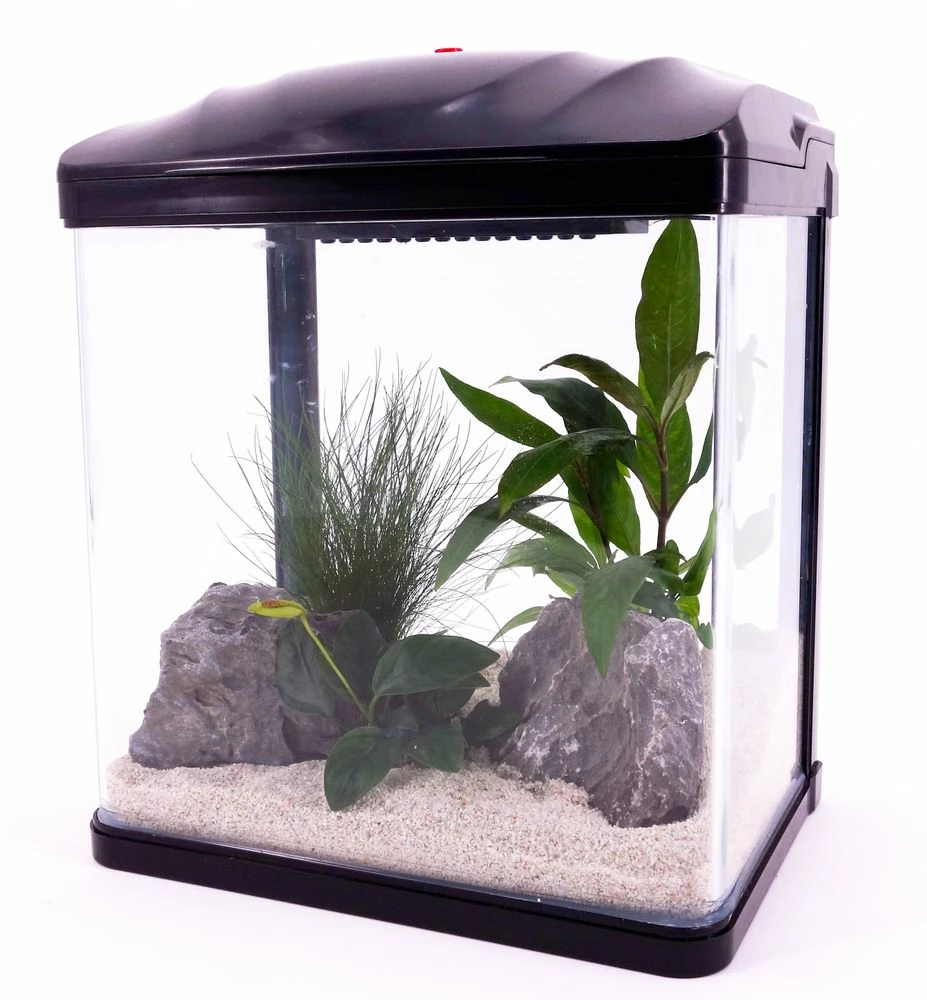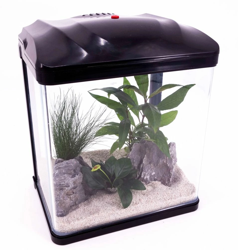 – Ein Nano Aquarium mit Komplettabdeckung inklusive Beleuchtung und integriertem Filter