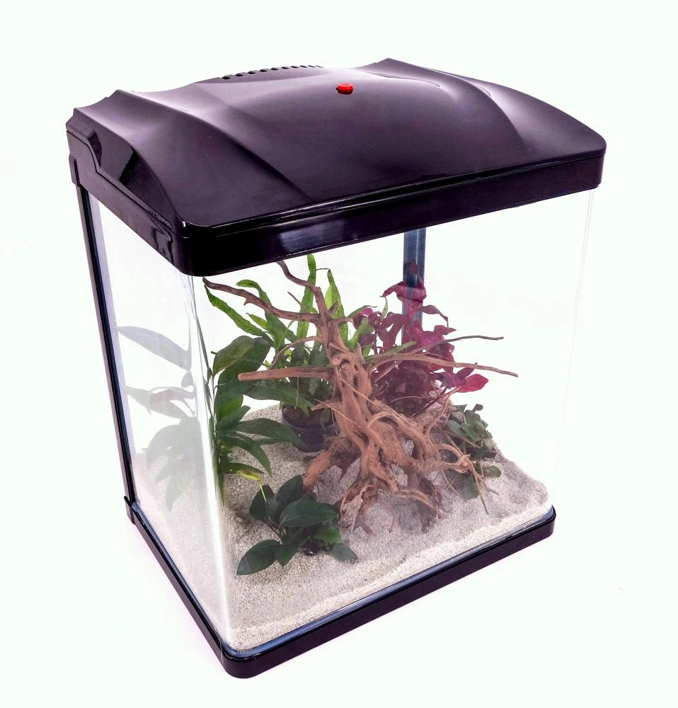 – Ein Nano Aquarium mit Komplettabdeckung inklusive Beleuchtung und integriertem Filter