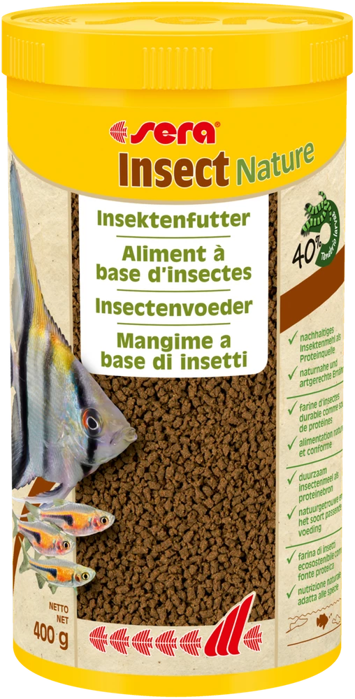 sera Insect Nature ist das Hauptfutter aus nachhaltigem Insektenmehl ohne Farb- und Konservierungsstoffe und enthält ausschließlich tierisches Protein aus Insektenmehl.