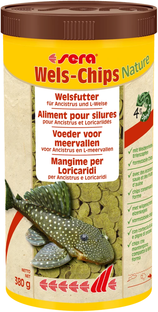 sera Wels-Chips Nature ist das Hauptfutter ohne Farb- und Konservierungsstoffe für raspelnde und saugende Bodenfische wie Ancistrus und L-Welse.