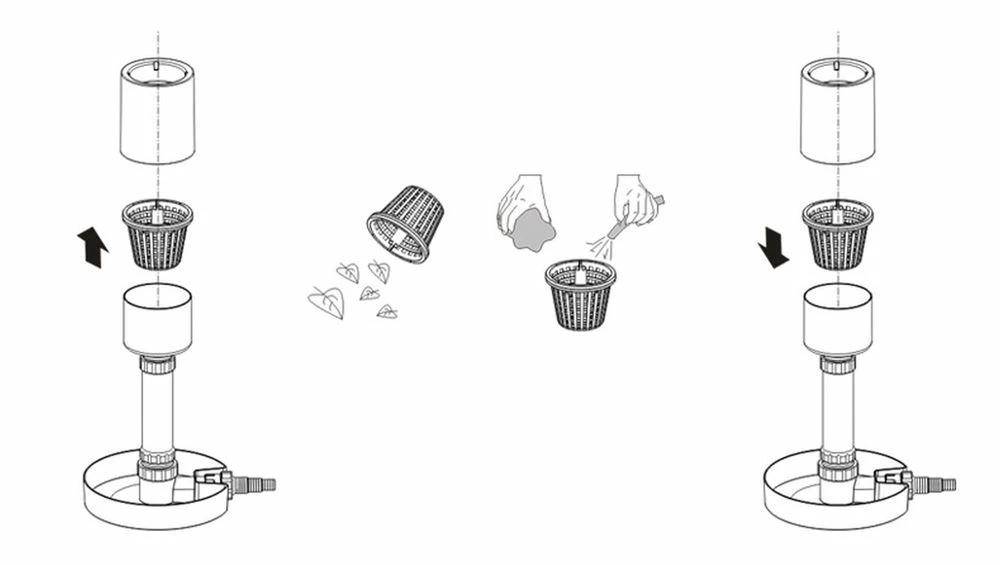 Blätter, Äste und andere Teile bleiben im Filterkorb hängen. Kleinere Schmutzpartikel werden vom Filterschwamm aufgefangen.